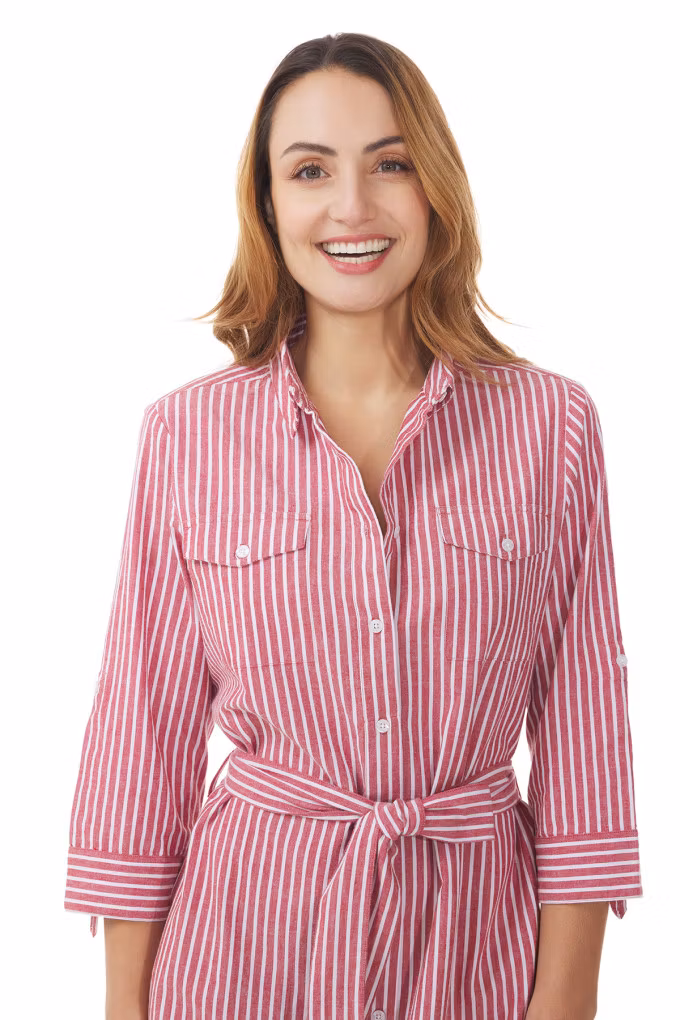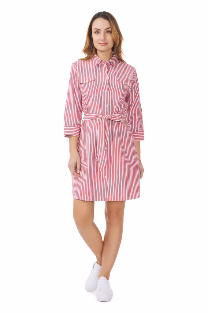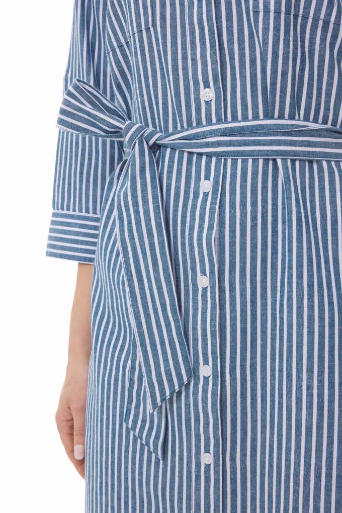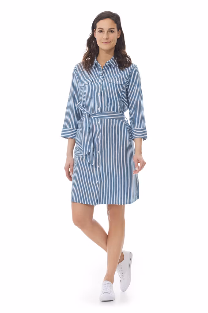 Lannilis från Mousqueton är en stilren skjortklänning i 100% bomull med knäppning framtill, bälte i midjan och 3/4-ärm. Perfekt för sommarens alla tillfällen.