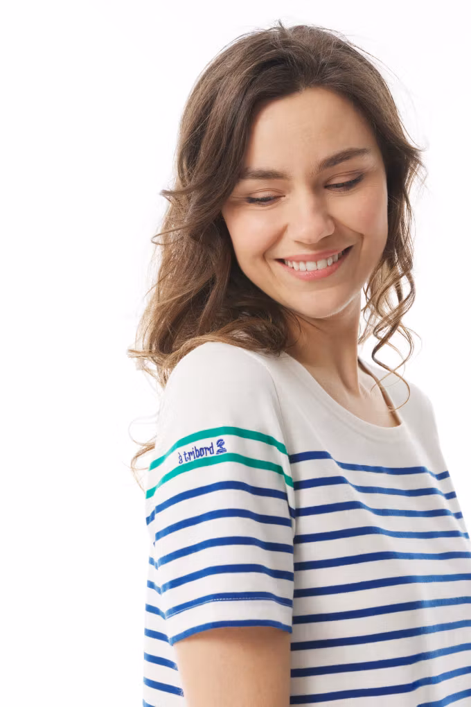 Marianig från Mousqueton är en stilren klänning med tydlig inspiration från det klassiska marina arvet. Den kombinerar en avslappnad, rak passform med lekfulla detaljer som för tankarna till sjöliv och kustnära miljöer.