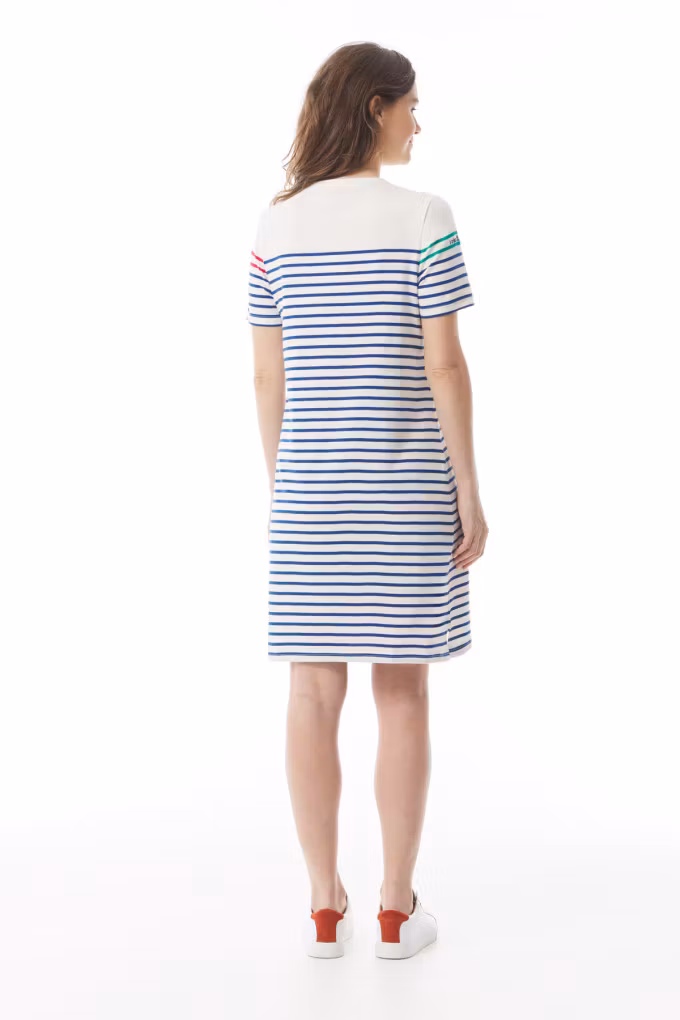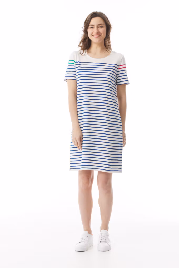Upptäck Marianig klänning från Mousqueton – en bekväm och stilren bomullsklänning med maritim design. Perfekt för vardag och sommarens lediga tillfällen!