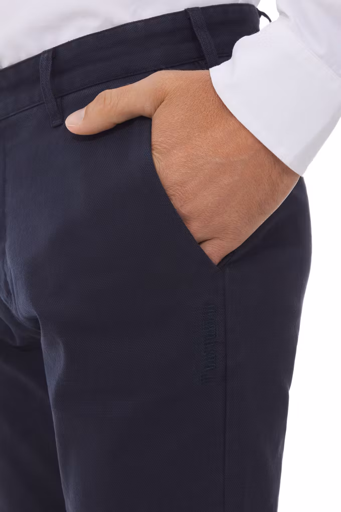 Ledig är ett par snygga och sköna chinos från det franska varumärket Mousqueton. Tillverkad i ett bekvämt stretchmaterial i en blandning av bomull och elastan med formade ben. Byxorna har två italienska fickor framtill och två med knapp baktill.