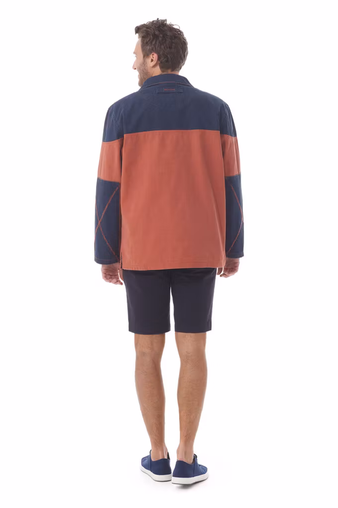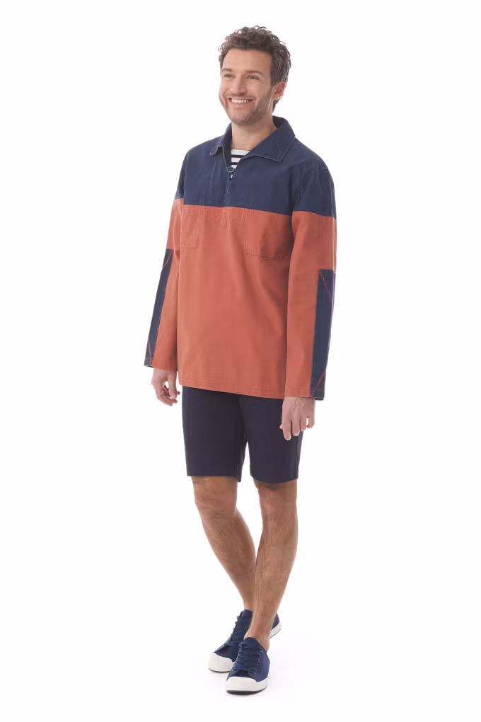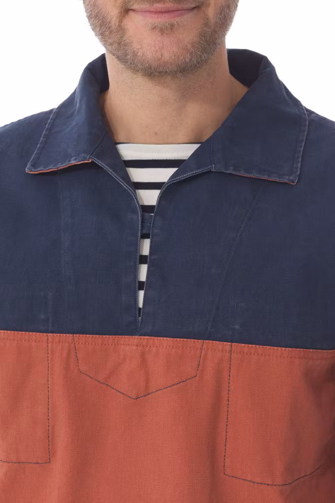 Daoucachou är en tvåfärgad jacka från det franska varumärket Mousqueton. Denna klassisker har blivit en favorit bland fiskare till havs på grund av sin robusthet och vindtäta egenskaper. Övre delen är i marinblått och den nedre har en kontrasterande färg för en distinkt look. Jackan har en knäppt krage och är skuren i en tidlös, rak och enkel passform med långa ärmar. Förstärkta ärmar och sidsömmar med dubbelstiftning ger extra hållbarhet. Sidofickor och kontrasterande armbågar dekorerade med zigzag-sömmar. Innerfickor på bröstet med synliga sömmar på utsidan ger både stil och funktion.